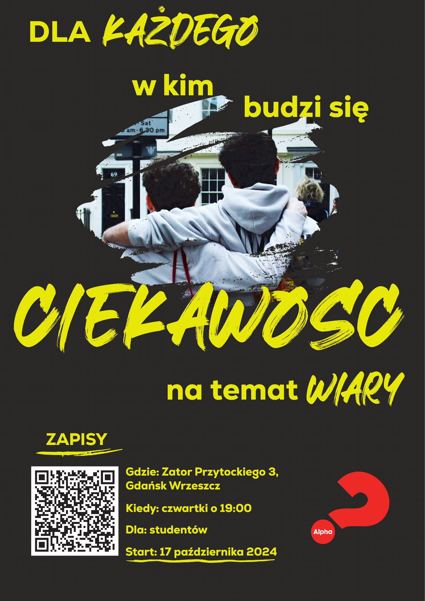Zapraszamy na 10 spotkań w ramach kursu Alpha. Nasze spotkania rozpoczynamy 17 października 2024 r. o godz. 19.00 w salce duszpasterstwa akademickiego Na Czarnej. Przewidujemy również grupę anglojęzyczną.