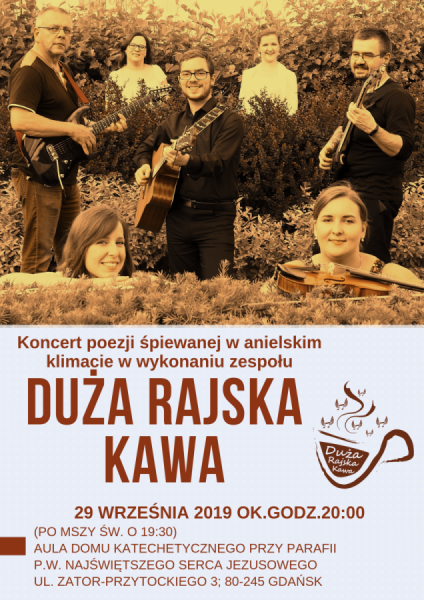 29go września (niedziela) w Auli Domu Katechetycznego, po Mszy Świętej o godzinie 19:30 będziemy gościć u nas w parafii zespół Duża Rajska Kawa.