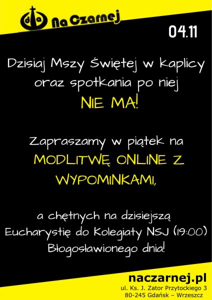 Przypominamy, że ze względu na sytuację epidemiczną i zaostrzenie przepisów sanitarnych oraz bezpieczeństwo uczestników od niedzieli 25 października 2020 roku msza święta akademicka (celebrowana dotychczas o 19.30 w kaplicy) będzie odprawiana o godz. 20.00 w kościele NSJ.