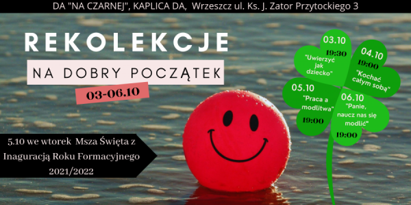 2. Zapraszamy na Rekolekcje Akademickie "Na dobry początek...", które rozpoczną się w niedzielę 03 października o godz.19.30 w Kaplicy Akademickiej w domu parafialnym i potrwają do 06 października. W kolejnych dniach spotykamy się o godz. 19.00.