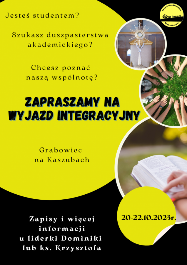Studentów, którzy chcieliby dołączyć do naszego duszpasterstwa zapraszamy na Adapciak, czyli wyjazd integracyjno - modlitewny w dniach od 20 do 21 października 2023, wybieramy się do Grabowca na Kaszubach. Wyruszamy z Gdańska w piątek wieczorem, a wracamy w niedzielę po obiedzie.