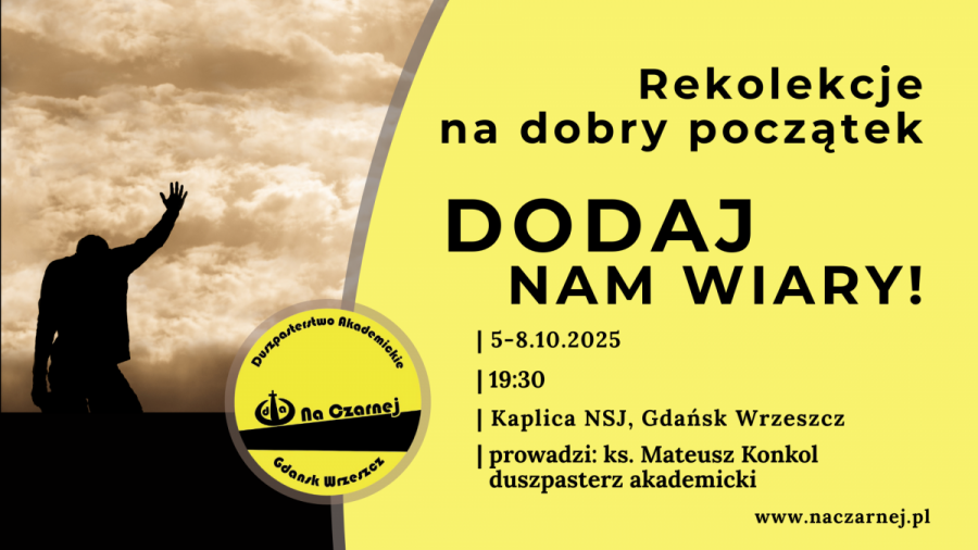 Zapraszamy Was na Rekolekcje na dobry początek. Codziennie od 5 do 9 października w naszej kaplicy akademickiej będziemy spotykać się na Eucharystii i konferencjach, prosząc: "Panie, dodaj nam wiary!".