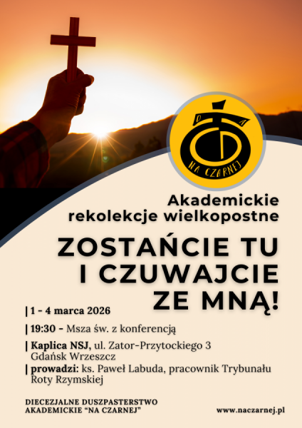 Zapraszamy na Akademickie Rekolekcje Wielkopostne pod hasłem "Zostańcie tu i czuwajcie ze Mną!", które odbędą się w dniach 1-4 marca 2026 r. W tym roku naszym przewodnikiem po rekolekcyjnych ścieżkach będzie ks. Paweł Labuda, kapłan archidiecezji gdańskiej, pracownik Trybunału Roty Rzymskiej.